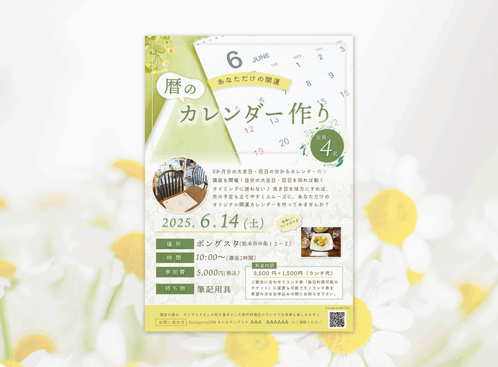 6月の春のイメージと「開運」をイメージできるよう明るい印象になるようデザインを意識しました。チラシを見た人が興味を持つようなキャッチコピーを配置し、集客に繋がるよう文章を考えました。